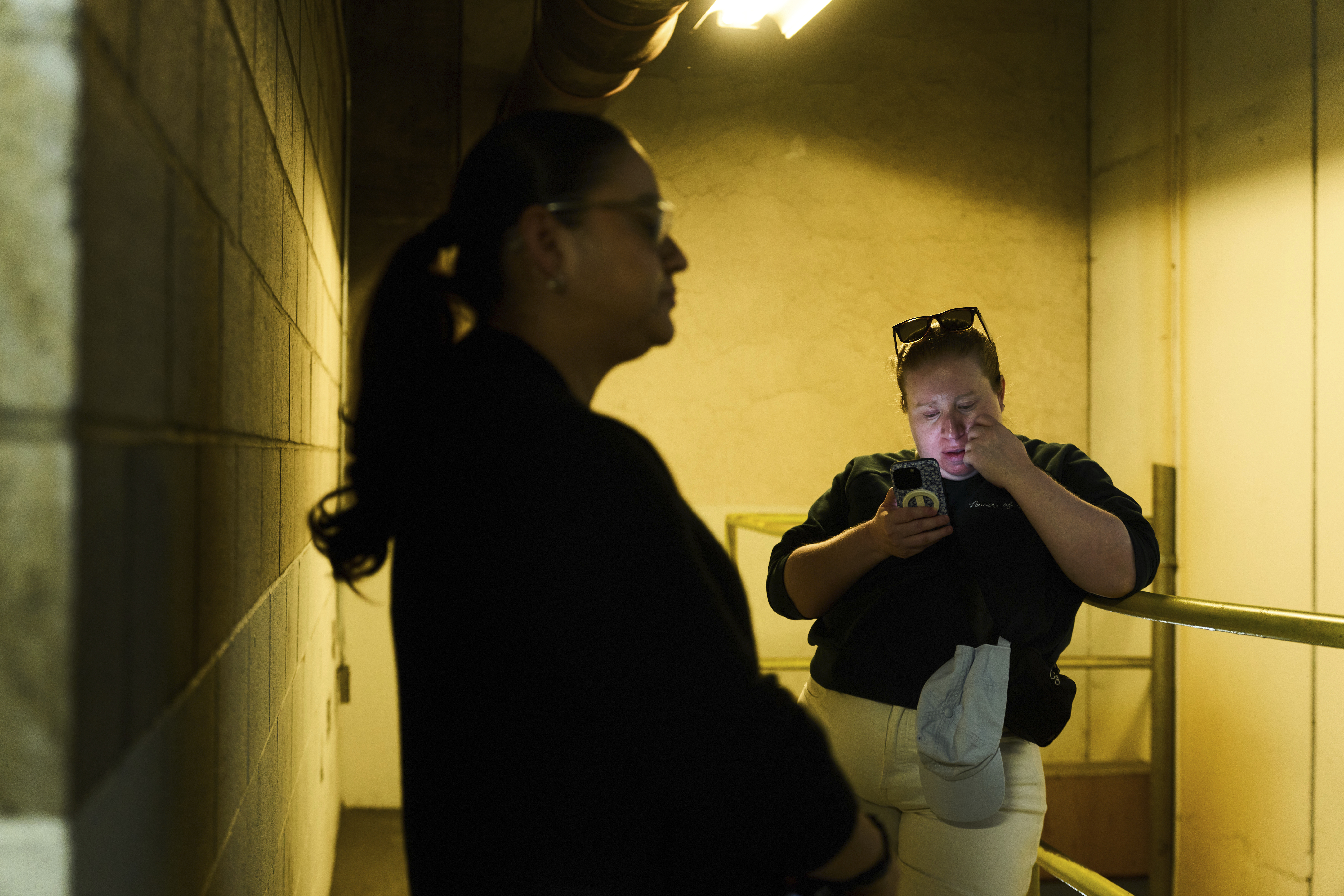 One family comforts a woman who is crying softly in the stairwell.