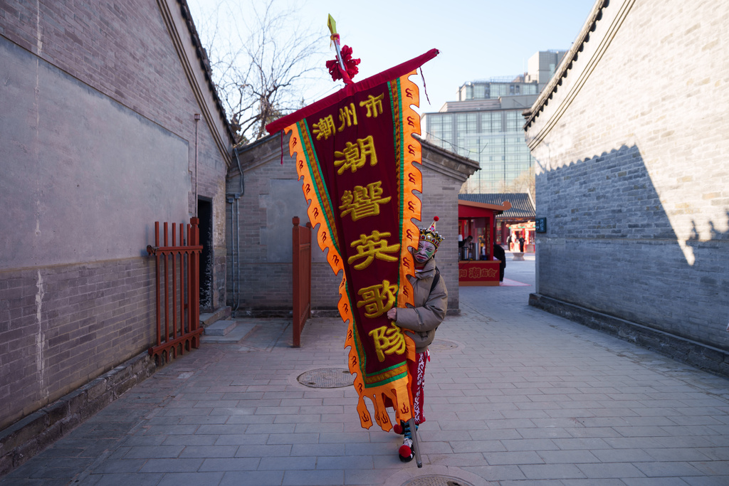 A dancer carries ceremonial banners before a performance of Yingge Dance, a traditional folk dance from southern China during Lunar New Year celebrations in Beijing, China, Tuesday, Feb. 17, 2026. (AP Photo/Vincent Thian)