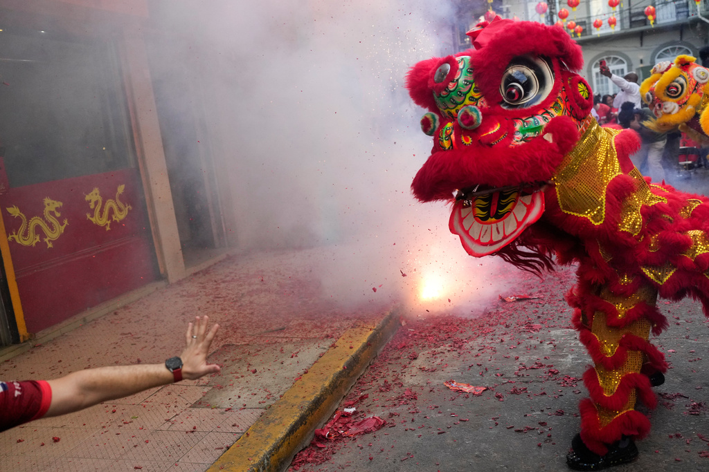 People perform a lion dance and throw fireworks to celebrate the Lunar New Year in Panama City, Tuesday, Feb. 17, 2026. (AP Photo/Matias Delacroix)